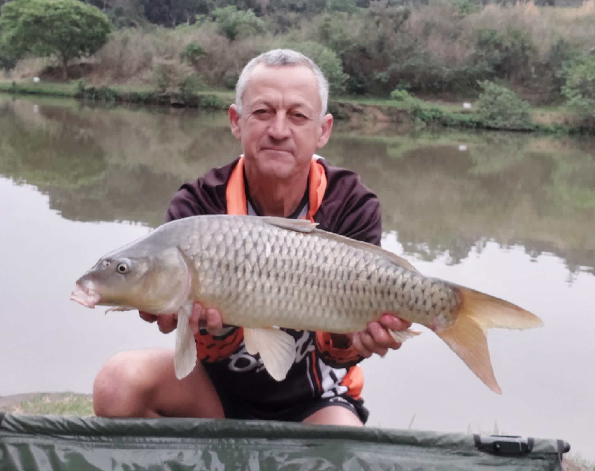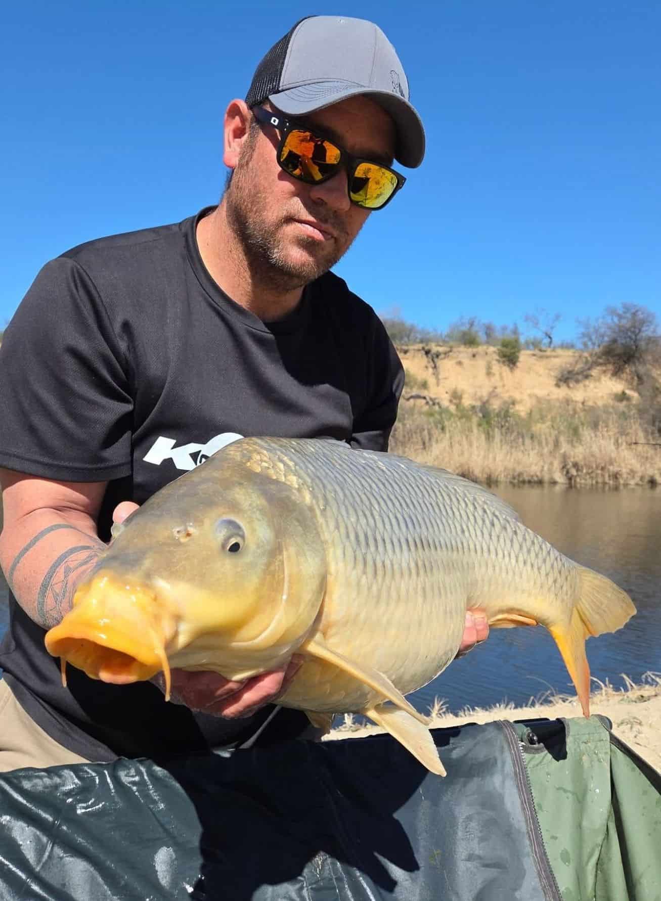 Johan Oosthuizen recently shared his second impressive catch from a specimen fishing trip on the Vaal River, just outside of Parys. During this outing, he used a hair rig with two Honey Glow Mealies as bait, which he enhanced by coating it in Honey Comb HEP powder. Additionally, he prepared a PVA bag infused with Honey Comb SloLeak Magic Potion for even better results.